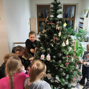 Dzieci tworzyły własne ozdoby na choinkę, a następnie wspólnie ją przystroiły. Powstała piękna, magiczna choinka, która idealnie komponuje się ze świąteczną ścianką i kalendarzem adwentowym. Na zakończenie zajęć wspólnie otworzyliśmy pierwsze okienko kalendarza adwentowego – radości było co niemiara!