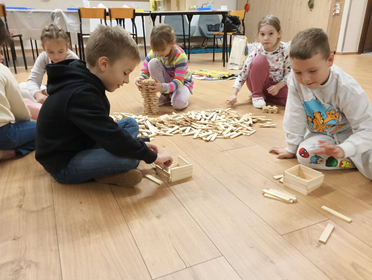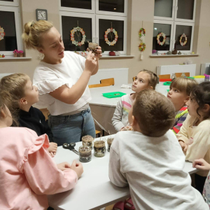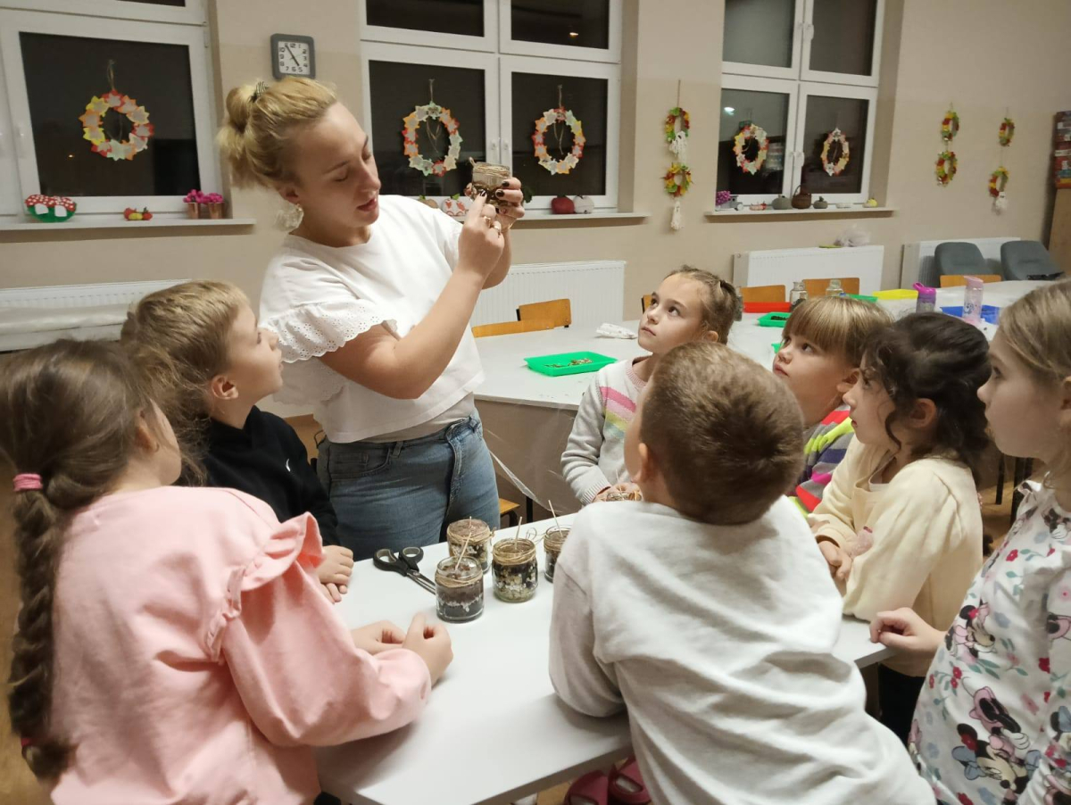 17 listopada w Sali w Nowej Wsi dzieci tworzyły własne świece z naturalnego wosku. Każde dziecko mogło samodzielnie skomponować dekoracje, wybierając spośród dużych kamyków w kolorze białym, czarnym i złotym, suszonych kwiatków, anyżu, laski cynamonu oraz innych drobnych ozdób. Gotowe kompozycje zostały umieszczone w słoiczkach, dzięki czemu każda świeca jest wyjątkowa i niepowtarzalna.
