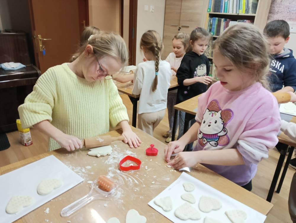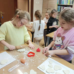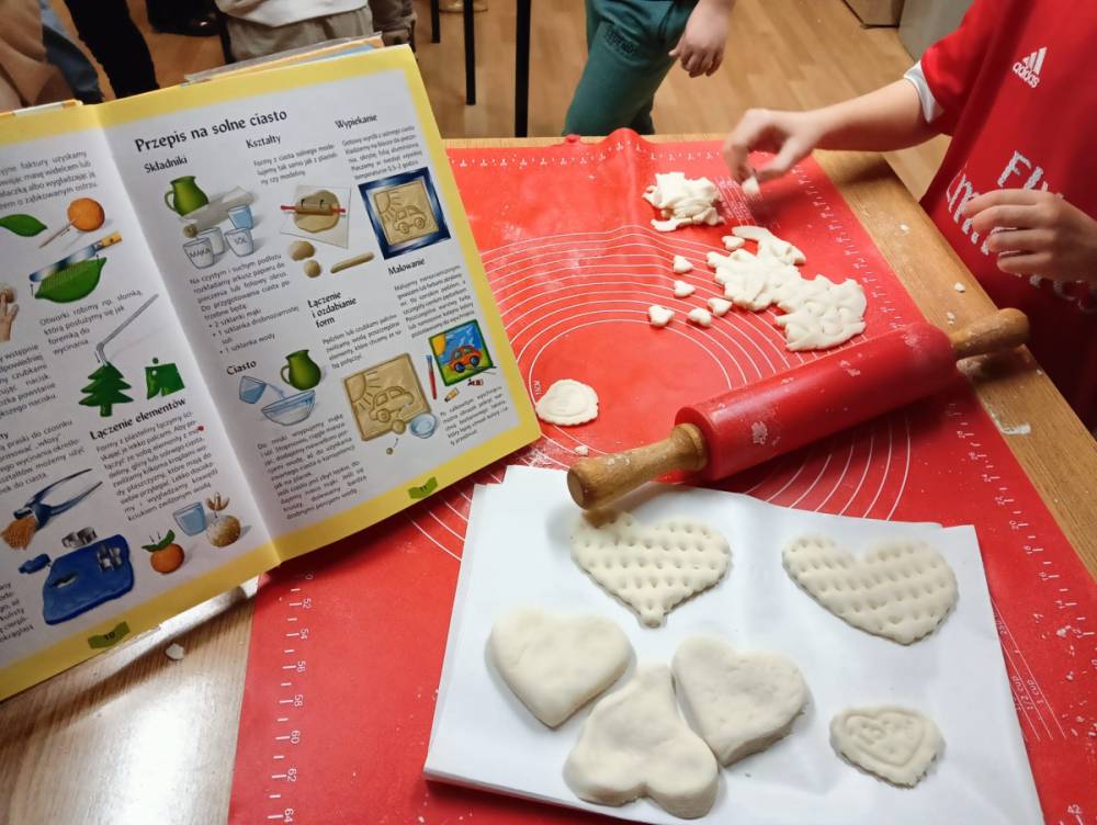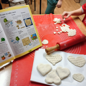 Korzystając z książki „Księga pomysłów”, wspólnie wyszukaliśmy przepis i krok po kroku poznawaliśmy sposób jej przygotowania. Dzieci miały okazję zobaczyć, jak wyrabia się masę, a następnie samodzielnie ugniatały ją, wałkowały oraz wykrawały foremkami serca w różnych wielkościach