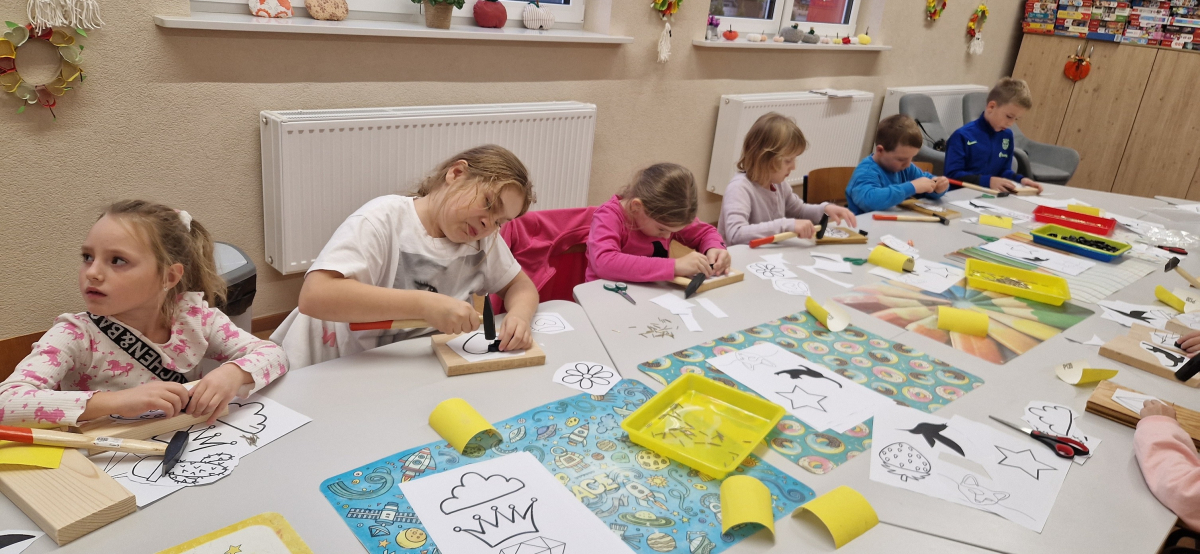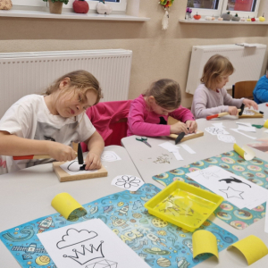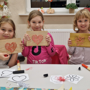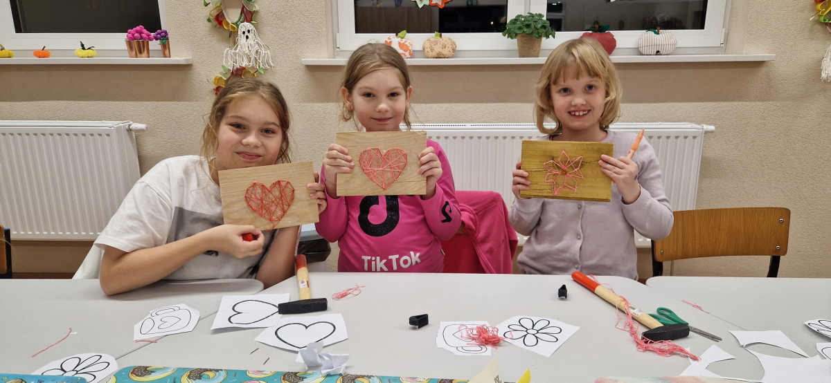 27 października w Sali w Nowej Wsi odbyły się warsztaty String Art. Metoda String Art, stosowana podczas pracy dzieci, polega na tworzeniu kolorowych obrazów poprzez napięcie nici wokół gwoździ wbitych w drewniane podłoże. Dzieci miały do dyspozycji płaskie, prostokątne lub kwadratowe deski, które pełniły funkcję podstawy. Na ich powierzchni wyznaczano kontury wybranego wzoru lub obrazka, w miejscach tych wbijały gwoździe. Następnie, korzystając z kolorowych nici, dzieci owijając je wokół gwoździ, tworzyły różnorodne wzory i kształty, takie jak serca, gwiazdy, szafiry czy truskawki. Po zakończeniu owijania niciami końcówki były zabezpieczane, co pozwalało na zawieszenie gotowej pracy na ścianie lub jej wykorzystanie jako ozdoby.