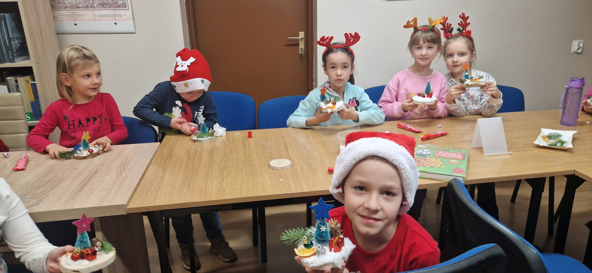 W poniedziałek w bibliotece wydarzyła się prawdziwa magia. Dzieci tworzyły świąteczne stroiki i słuchały bajki o Mikołaju.