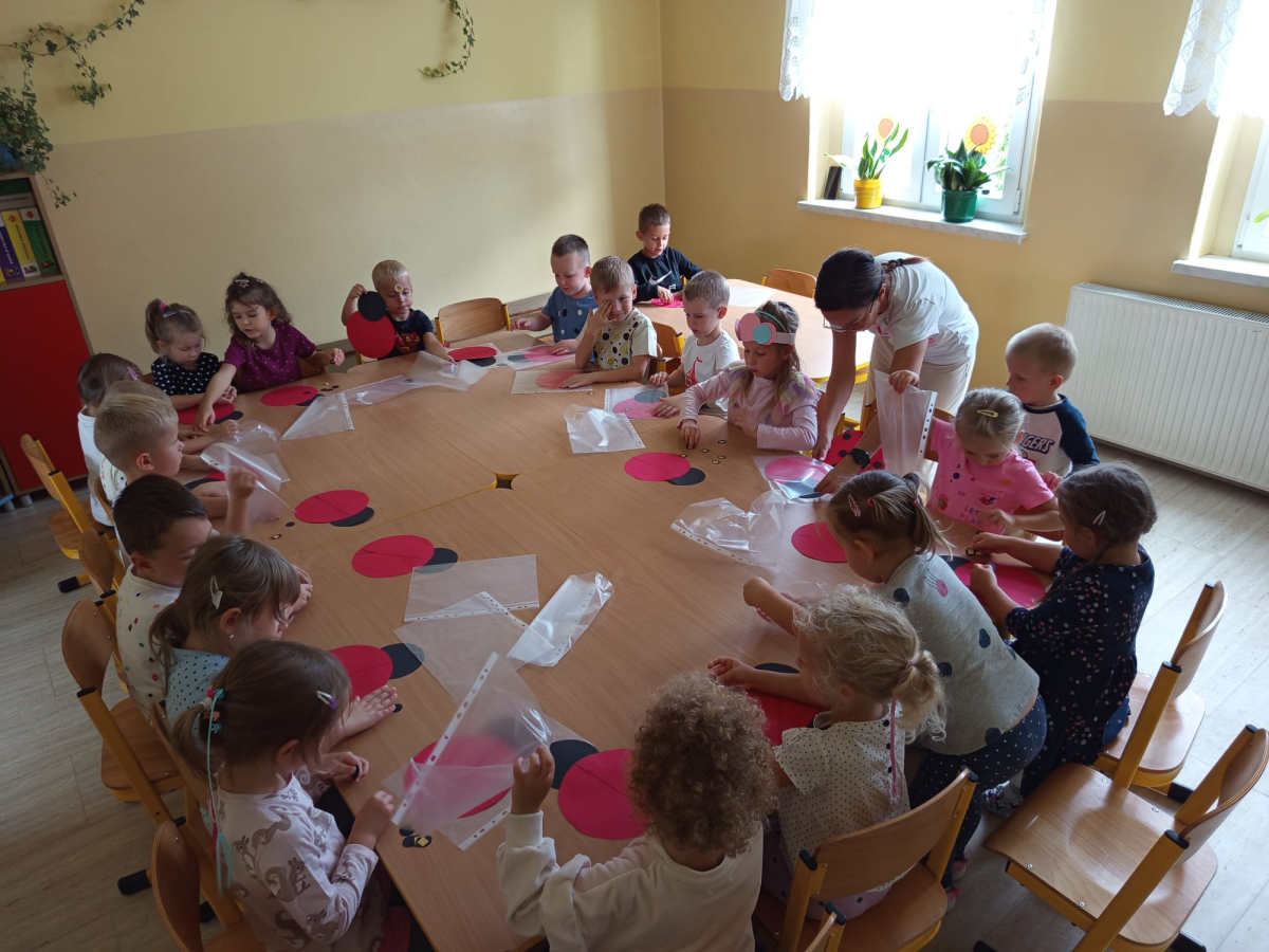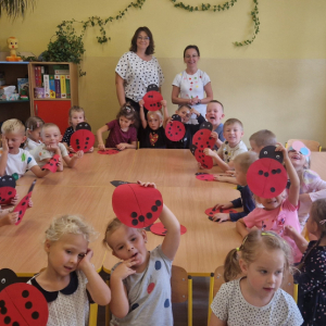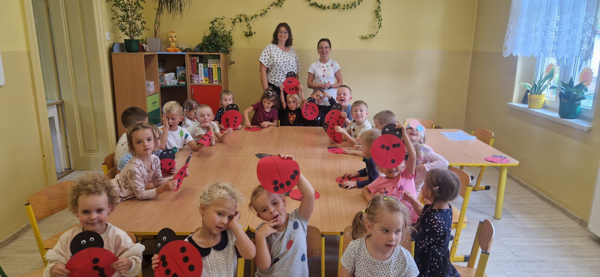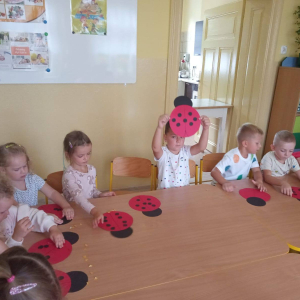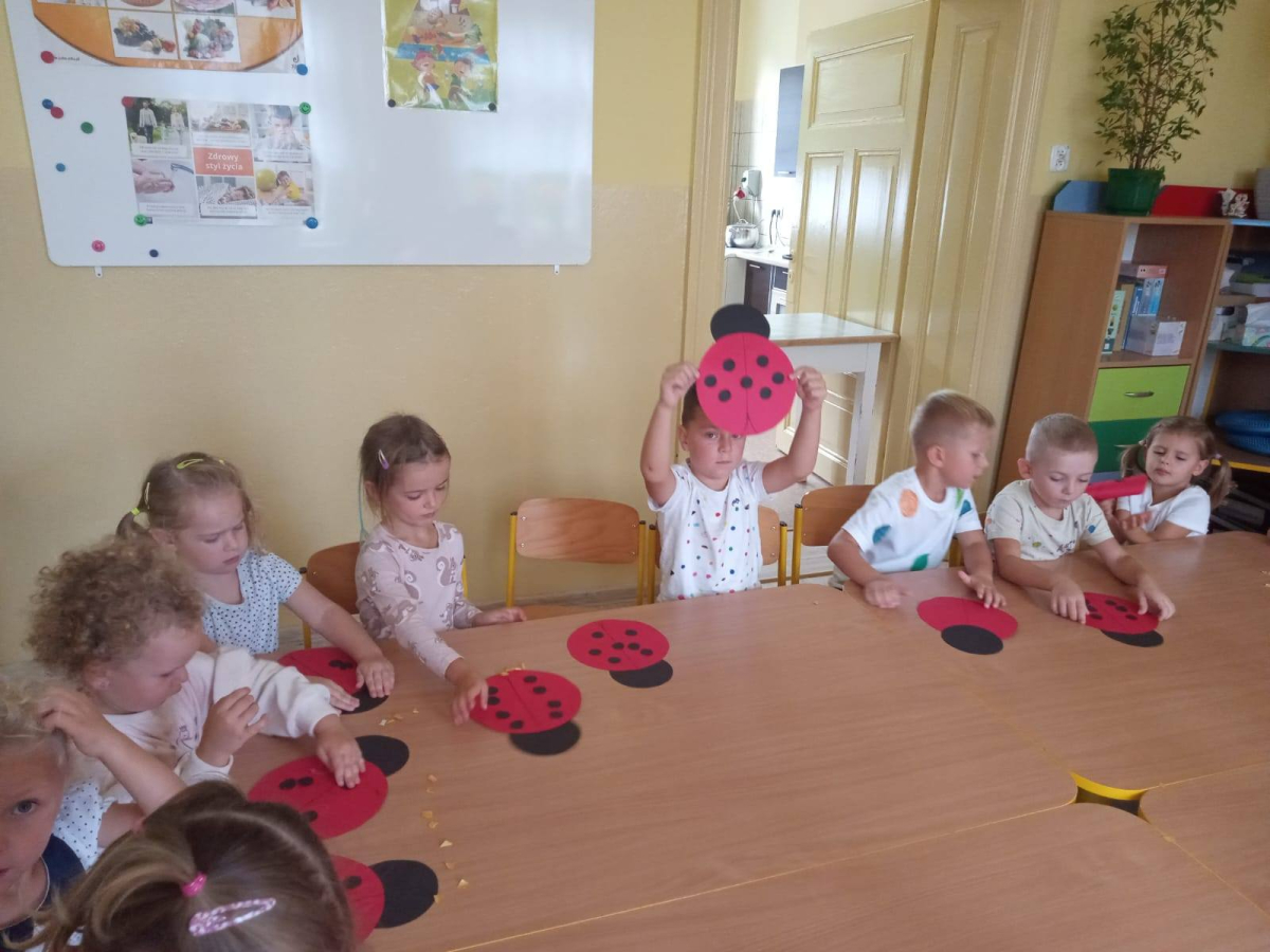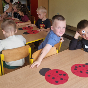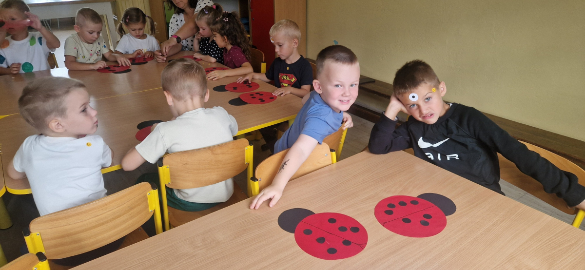 Przedszkolaki bawiły się w poszukiwanie kropek w sali i szybko odkryły, że kropki można znaleźć prawie wszędzie.Były też zabawy ruchowe i plastyczne – dzieci tworzyły śliczne biedronki oraz malowały małe i duże, kolorowe kropki na brystolach.
