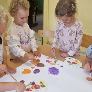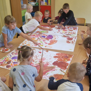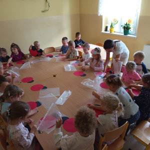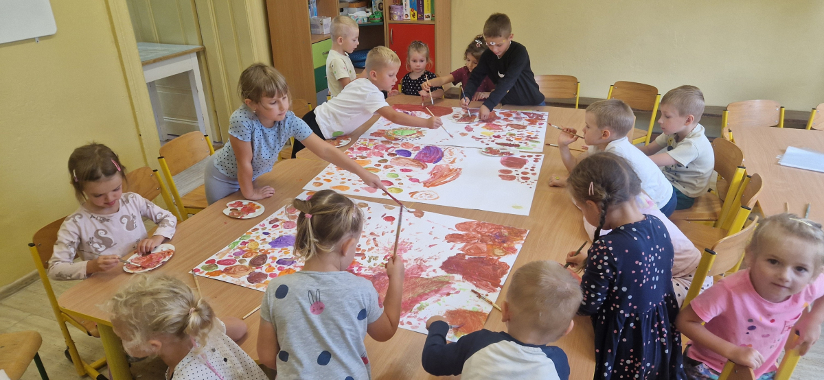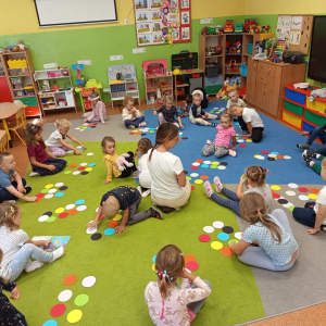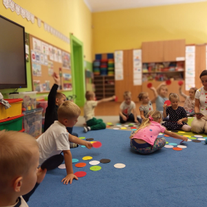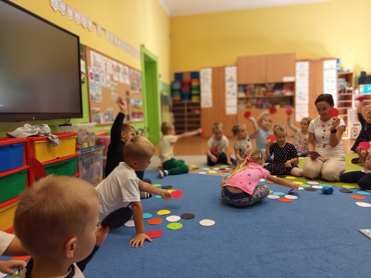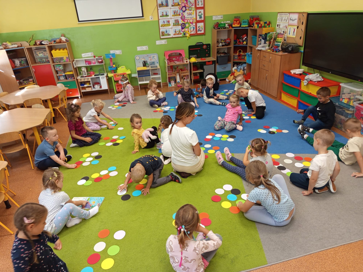 Przedszkolaki bawiły się w poszukiwanie kropek w sali i szybko odkryły, że kropki można znaleźć prawie wszędzie.Były też zabawy ruchowe i plastyczne – dzieci tworzyły śliczne biedronki oraz malowały małe i duże, kolorowe kropki na brystolach.